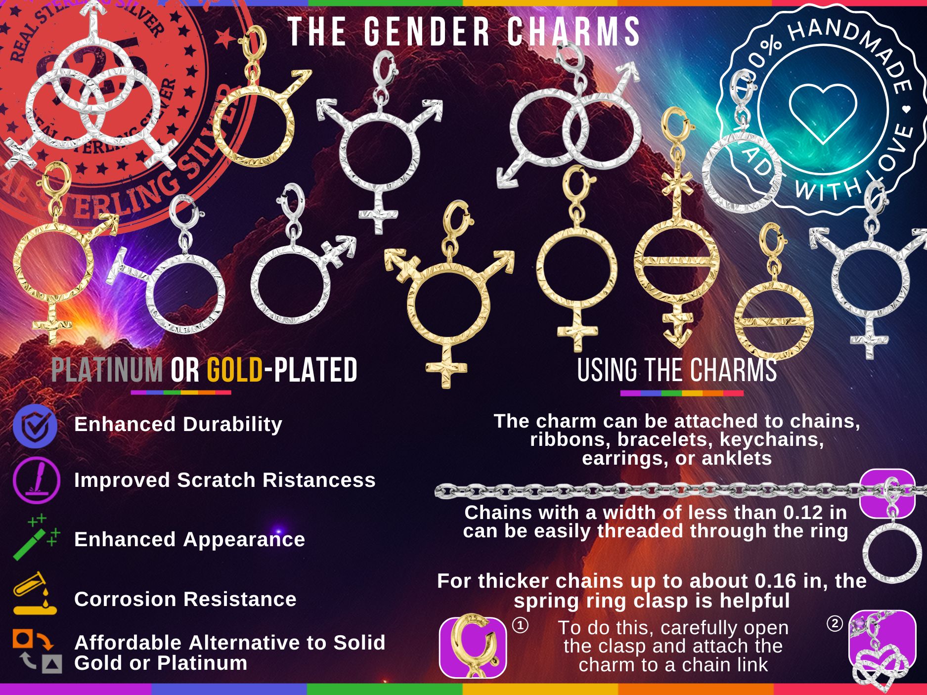 -) Subtle yet expressive LGBTQ+ 925 STERLING SILVER pendant – 1 x 1 inch / 25 x 25 mm(+0.35 inch / 9 mm bail with spring ring clasp) 1.5g / 0.053 oz, Platinum plated